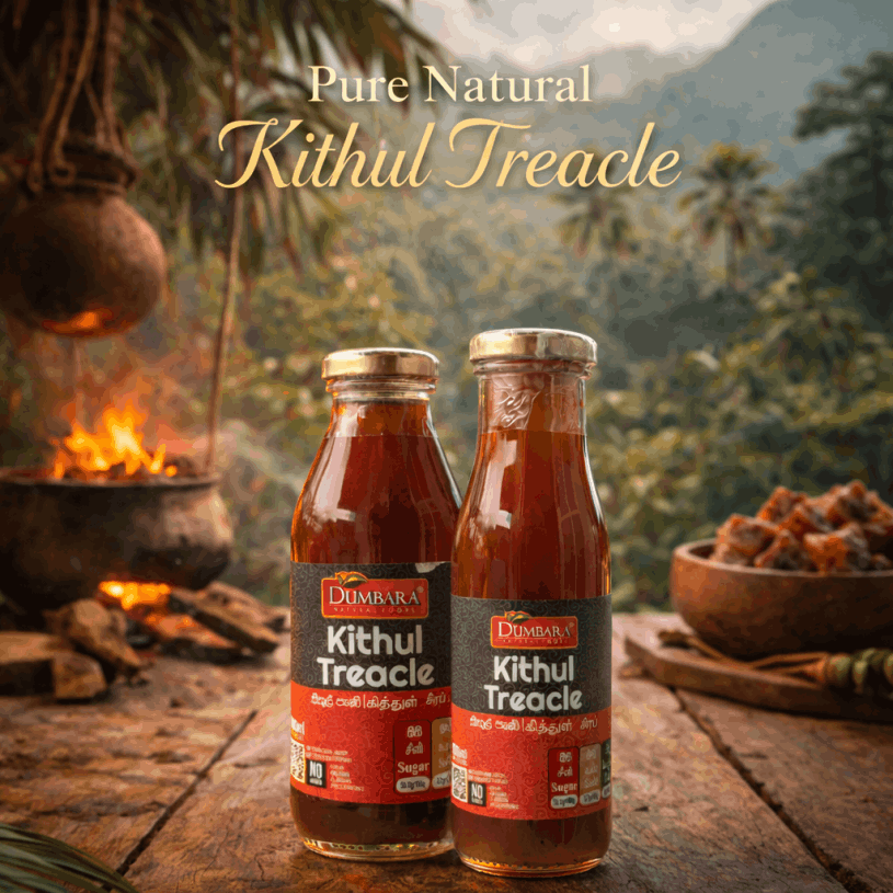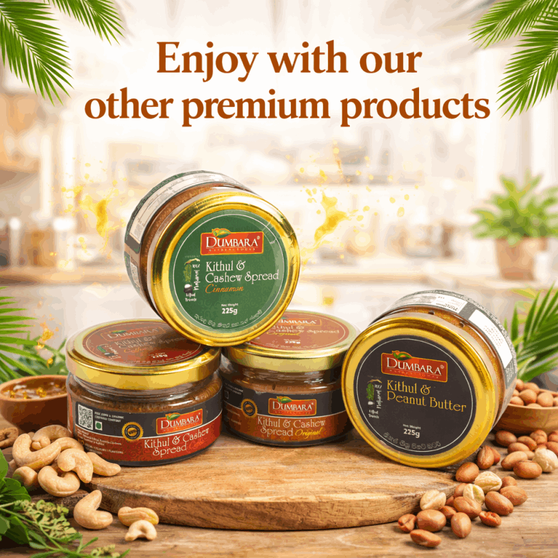 Dumbara Kithul Treacle is made from 100% pure Kithul sap, carefully crafted to preserve its rich, natural sweetness with no added sugar, preservatives, or artificial ingredients — offering a pure and wholesome alternative to refined sweeteners.